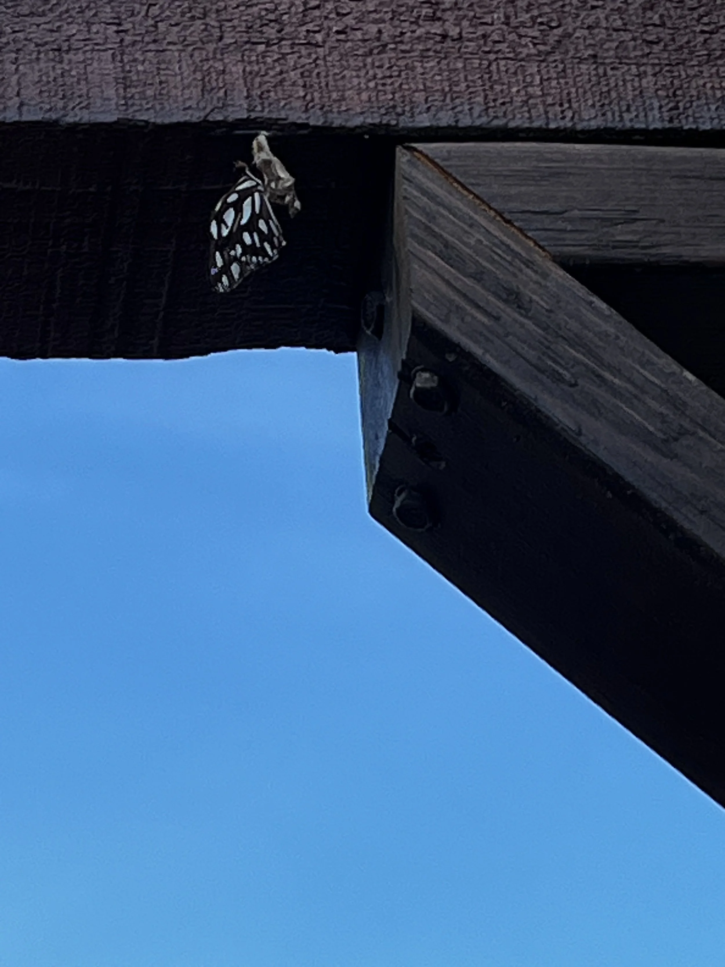 A Gulf Fritillary butterfly emerging from it’s chrysalis on a beam in my backyard.